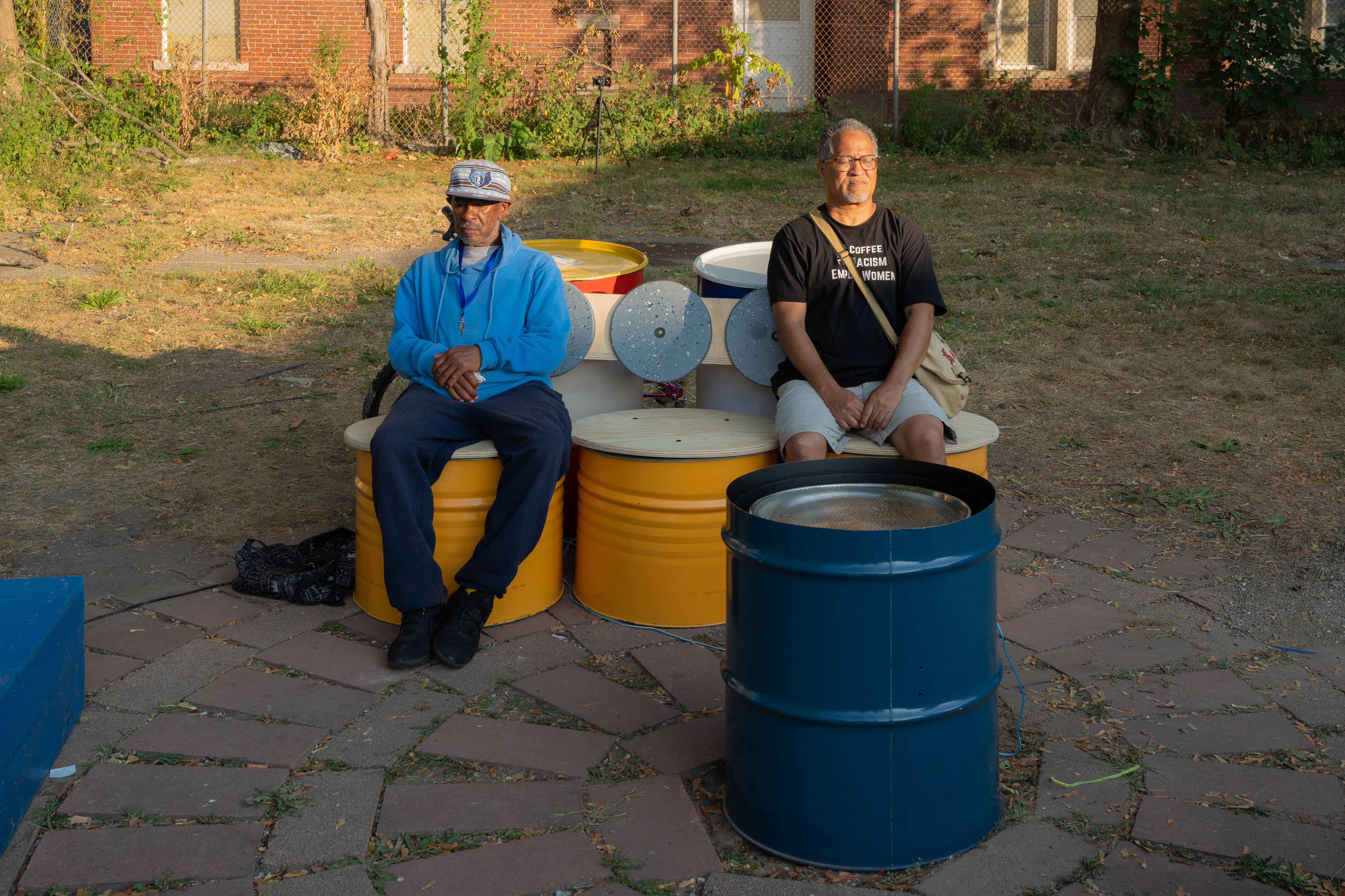 This project offers a somatic experience for the public to engage with sound across the senses through visualizations, vibration, and transference. Visitors are invited to activate sonic frequencies that resonate through the back of a bench and generate waveforms in a water fountain, both of which are made from recycled 55-gallon steel barrels.